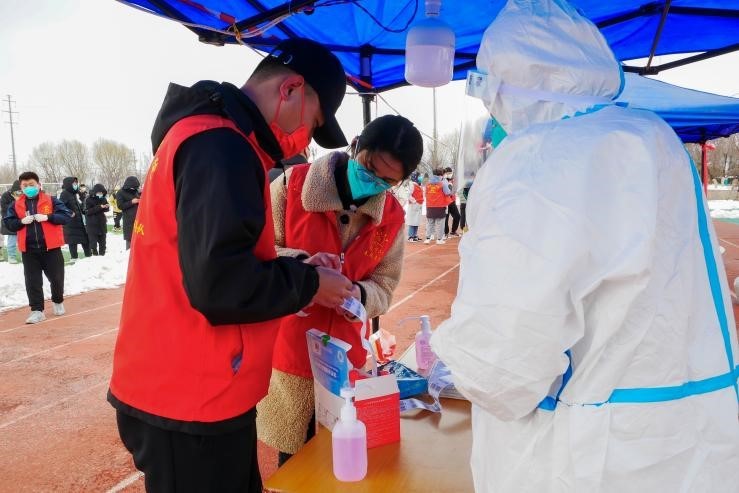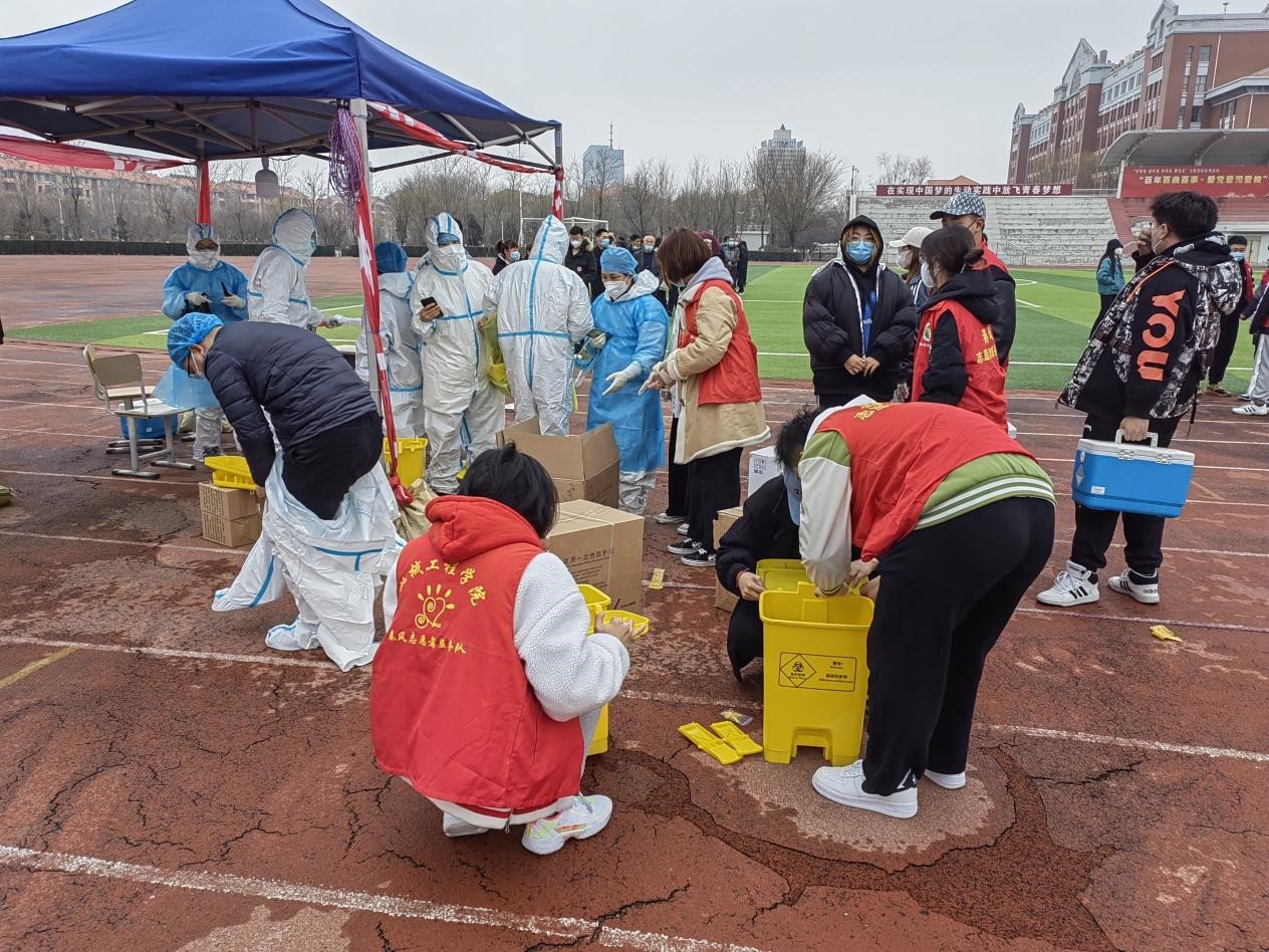 从布置核酸检测场地到搬运防疫物资,从维持人员秩序到做好健康码登记,从充当“跑腿小哥”到为隔离同学定点送餐,“红马甲”们活跃在校园各个角落,确保疫情防控工作平稳有序。特别是在全市第一轮全员核酸检测期间,志愿者们从中午忙到深夜,整整12个小时滴水未进,随着夜里温度降低,大家不顾防护服里凝结的汗水和脸颊勒红的印记,依然坚守岗位,引导同学们保持检测秩序。在第二轮核酸检测过程中,恰逢一场春雪降落,凛冽的寒风为室外工作带来诸多不便,志愿者们第一时间清理积雪,确保场地安全。核酸检测过程中,志愿者们手拿扬声器给同学加油鼓劲,让温暖的关怀在同学身边传递。