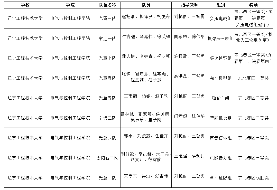 本次比赛,我校智能车队获得东北赛区一等奖3项,东北赛区二等奖3项,东北赛区三等奖2项的优异成绩。其中,由电气与控制工程学院熊扬清、郭泽良、杨振萍组成的“光翼三队”获得负压电磁组东北赛区一等奖(冠军);付吉灏、马嘉伟、徐英锷组成的“宁远一队”荣获摄像头三轮组东北赛区一等奖(季军);潘志博、李林青、祝少卿组成的“光翼七队”荣获东北赛区一等奖(预赛第一)。部分优秀队伍将代表东北赛区参加8月中旬的全国总决赛。