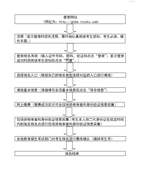 (一)报名基本流程为:考生网上填报基本信息→网上缴费→现场资格审查和身份验证信息采集→各地教育招生考试机构对考生报名进行最终确认(编排考生号)。