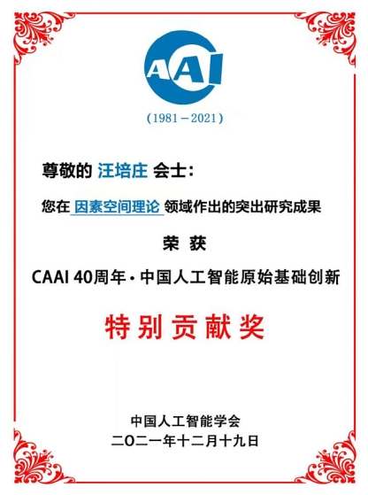 12月19日,中国人工智能学会(Chinese Association for Artificial Intelligence,简称“CAAI”)成立40周年之际,CAAI组委会举办了人工智能机器人创新大赛颁奖典礼。大会评选出十项“中国人工智能原始基础创新•特别贡献奖”,因在“因素空间理论”领域作出的突出研究成果,我校智能工程与数学研究院院长汪培庄教授荣获此奖项。CAAI组委会特邀请汪先生参会领奖,对汪先生为中国人工智能发展作出的贡献表示衷心感谢。