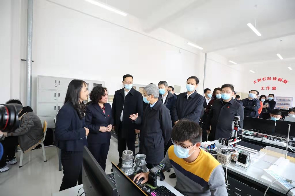 在“太阳石”科技创新工作室,陈宝生一行听取了电气与控制工程学院青年教师闫孝姮的汇报。在听取了她从事教学科研和服务国家建设、行业发展情况的汇报后,陈宝生跟她亲切握手,赞许她这“整整20年的努力”,鼓励她取得更大的进步。