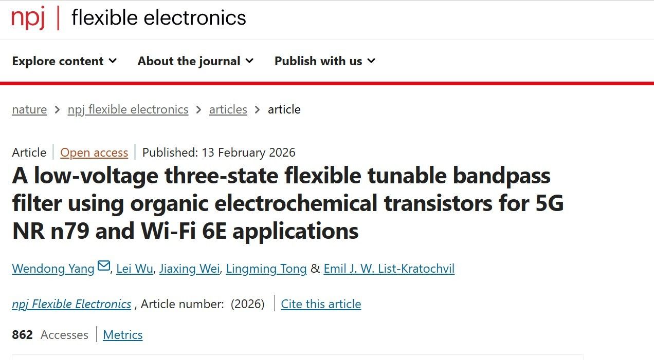 近日,我校电子与信息工程学院杨文冬教授研究组在国际顶级期刊Nature子刊《npj Flexible Electronics》(影响因子15.5,中科院1区Top期刊)上,成功发表了题为"A Low-Voltage Three-State Flexible Tunable Bandpass Filter Using Organic Electrochemical Transistors for 5G NR n79 and Wi-Fi 6E Applications"的研究论文。该成果以辽宁工程技术大学为第一署名单位,杨文冬教授为第一作者及通讯作者,硕士生吴磊为学生第一作者,合作单位包括柏林洪堡大学和亥姆霍兹柏林材料与能源中心。